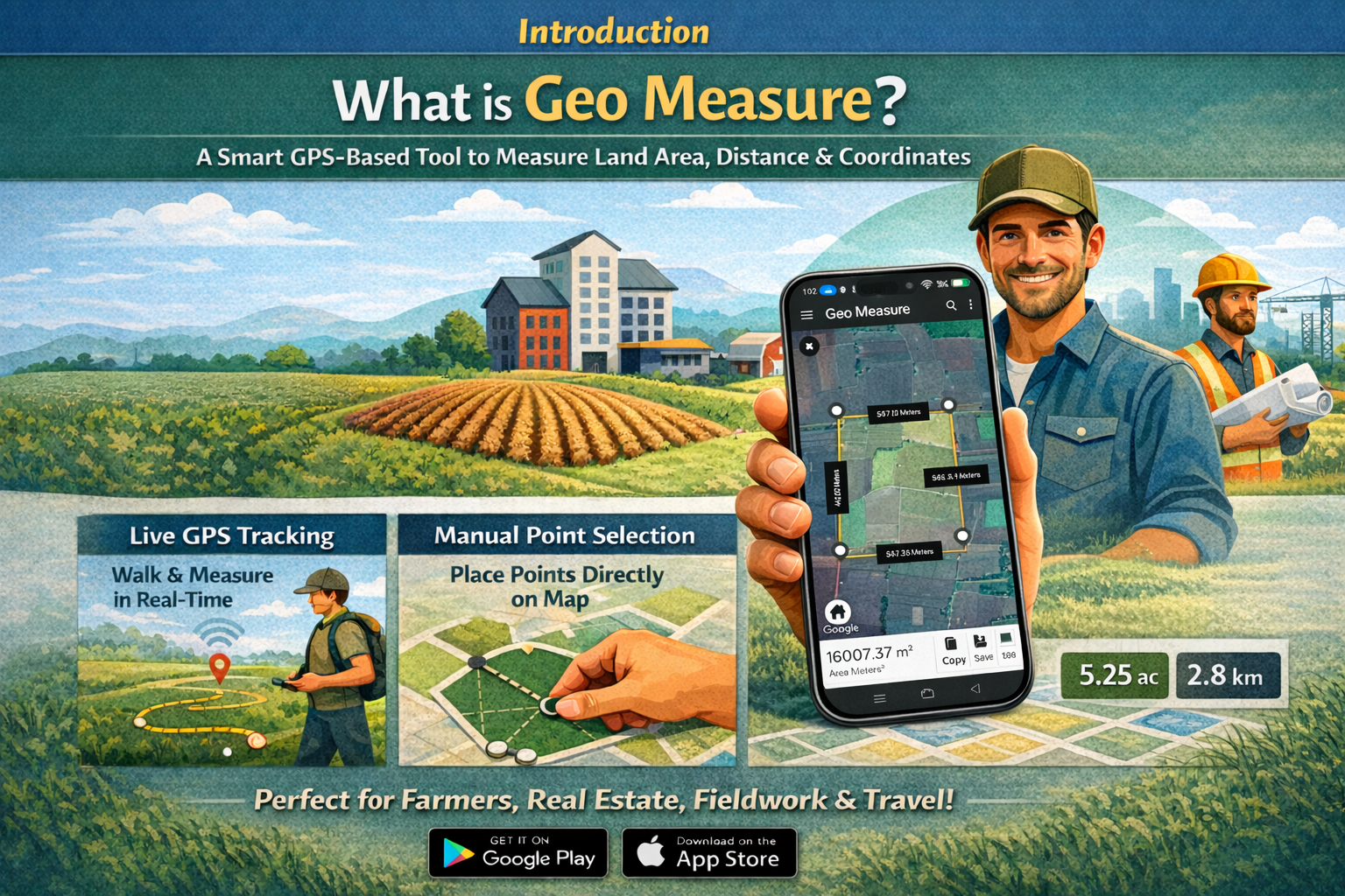 Geo Measure is a smart GPS-based tool used to measure land area, distance, and geographic coordinates using interactive maps. It allows users to mark points manually or measure boundaries using live GPS tracking. Geo Measure works on Android and iOS platforms, making it easy to access anytime. It is designed for farmers, real estate professionals, field workers, engineers, and anyone who needs accurate location measurements without traditional surveying tools.